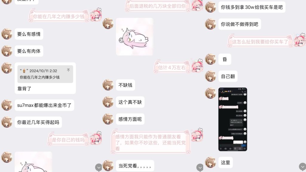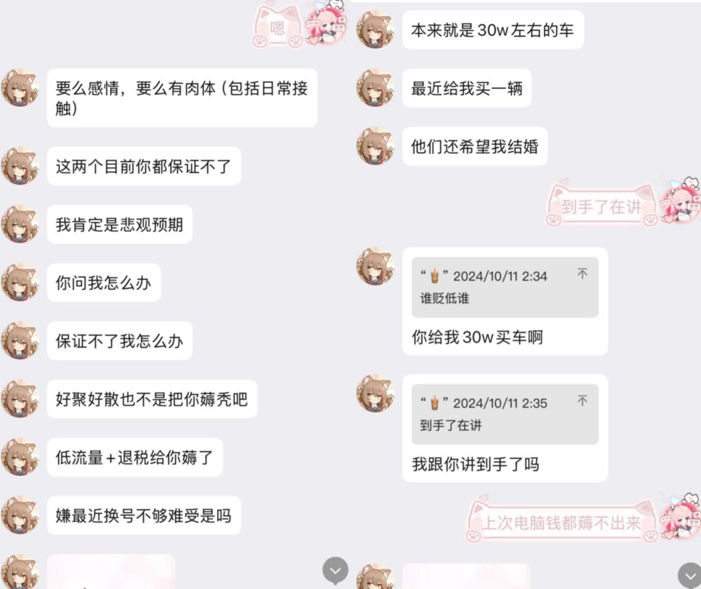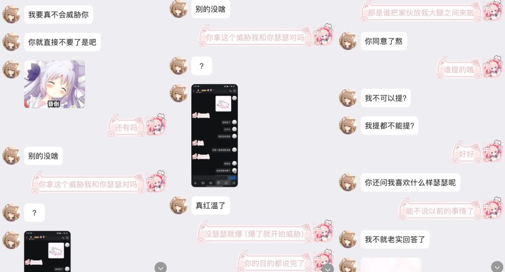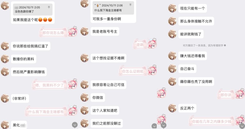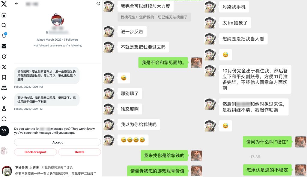 2025年1月,他再次威胁我:要么和他单独见面签订协议,否则一切免谈。他还不断拿“起诉我赔偿游戏账号损失”来施压,尽管我表示愿意赔偿,他却又强调“钱不是问题”,坚持要单独见面,否则就要再次曝光我的隐私。