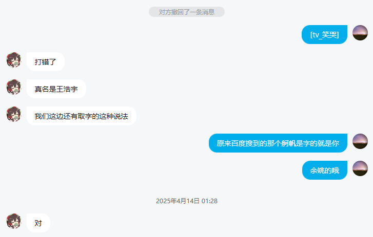 如果没记错的话,当时他撤回的是”我叫王舸帆“之类的。
