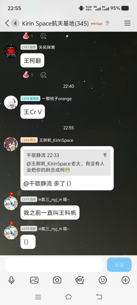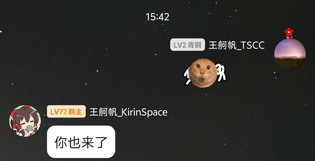 不过在8月初,千舸竞流把自己的QQ名改成了“王舸帆_TSCC”(ThoatraSeamCultureCenter),然后阴差阳错的在10号下午在Kirin Space航天基地群里发了个耄耋表情包,结果他忘了自己用的是默认用户名,便马上把自己的名字改成了“TSCC”,结果好巧不巧被王舸帆看到了,他说了句:“你也来了”