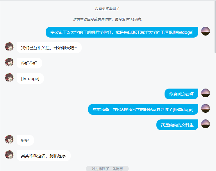 晚上23:30,千舸竞流给王舸帆发了句私信“宁波诺丁汉大学的王舸帆同学你好,我是来自浙江海洋大学的王舸帆[脱单doge]”,然后王舸帆_KirinSpace就和千舸竞流互关了。