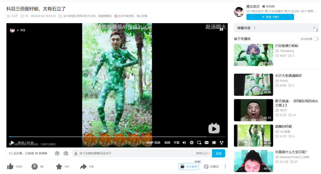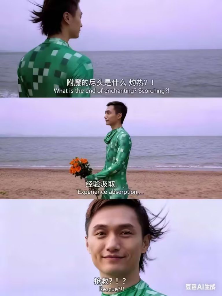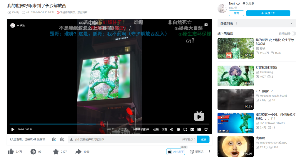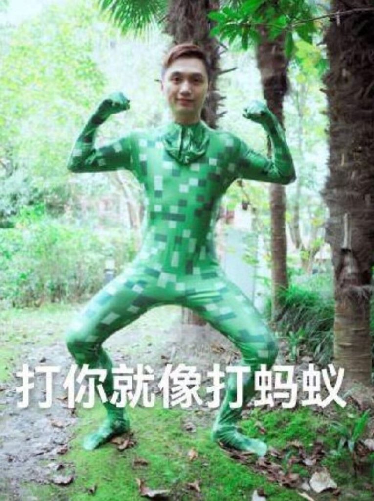 据船帆调查,早在2024年年初,就有人挖出籽岷的这个苦力怕照片来用AI做视频《科目三但是籽岷,太有石立了》(2024年2月2日)。2024年7月31日,有人在长沙搞了个籽岷的图《我的世界籽岷来到了长沙解放西》,当时其实是“打你就是打蚂蚁”,后来演变成了“打你就像打蚂蚁”。也就是说,“打蚂蚁”的梗出现在2024年上半年,而“这么强”相对要晚。